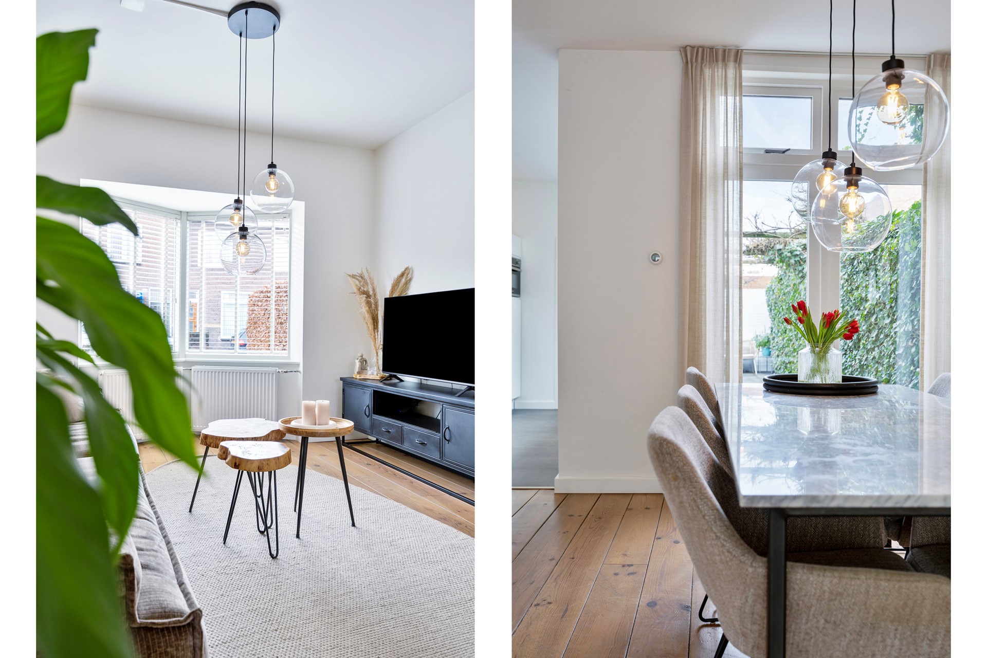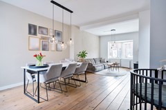 De woonkamer is zonder twijfel een van de meest uitnodigende ruimtes van het huis. Zodra je binnenstapt, voel je het: hier mag het leven even vertragen. De prachtige erker aan de voorzijde vangt het daglicht op elk moment van de dag en verspreidt het zacht door de ruimte. De royale indeling biedt alle vrijheid voor een comfortabele zithoek én een grote eettafel waar lange diners en goede gesprekken vanzelf ontstaan. Openslaande tuindeuren verbinden binnen moeiteloos met buiten, waardoor zonnige dagen vanzelf naar de tuin lonken.
