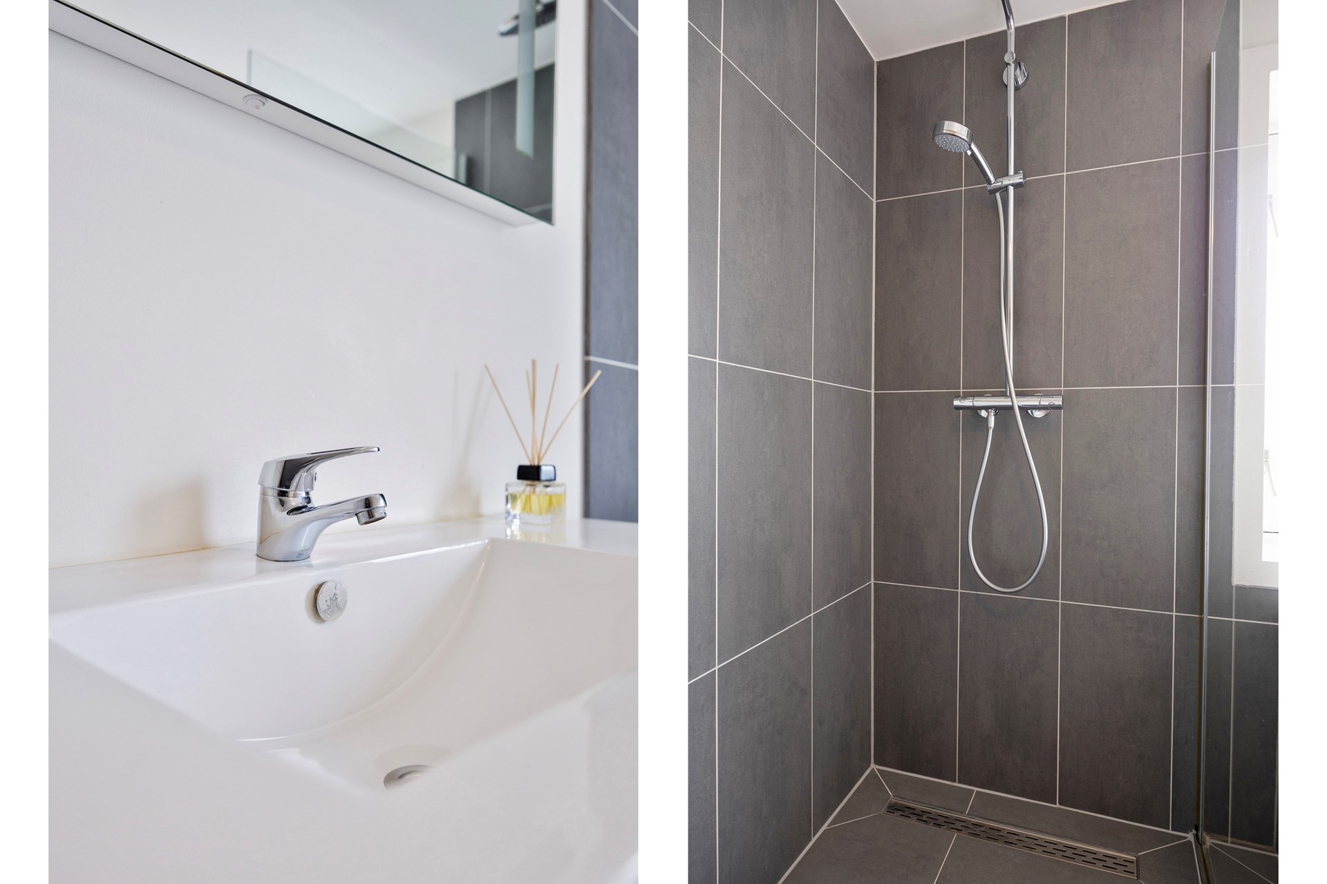 De badkamer voelt als een luxe hotelbadkamer: frisse tegels, een royale inloopdouche, een stijlvol wastafelmeubel met wastafel, een toilet én een ligbad zorgen voor een plek waar ontspannen vanzelfsprekend wordt. Een heerlijke ruimte om de dag rustig te beginnen of juist ontspannen af te sluiten.