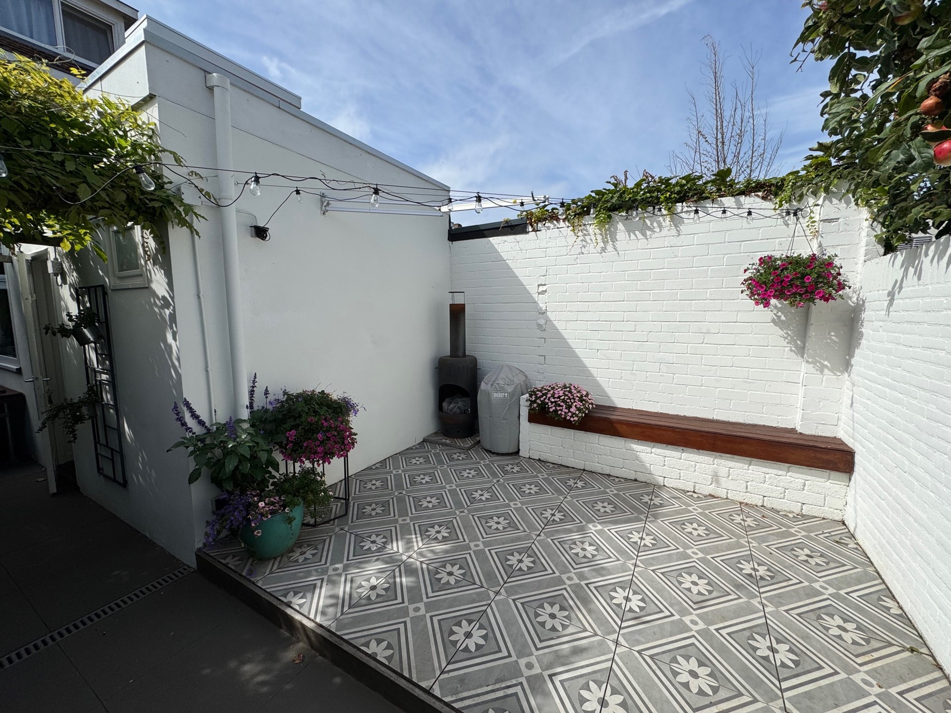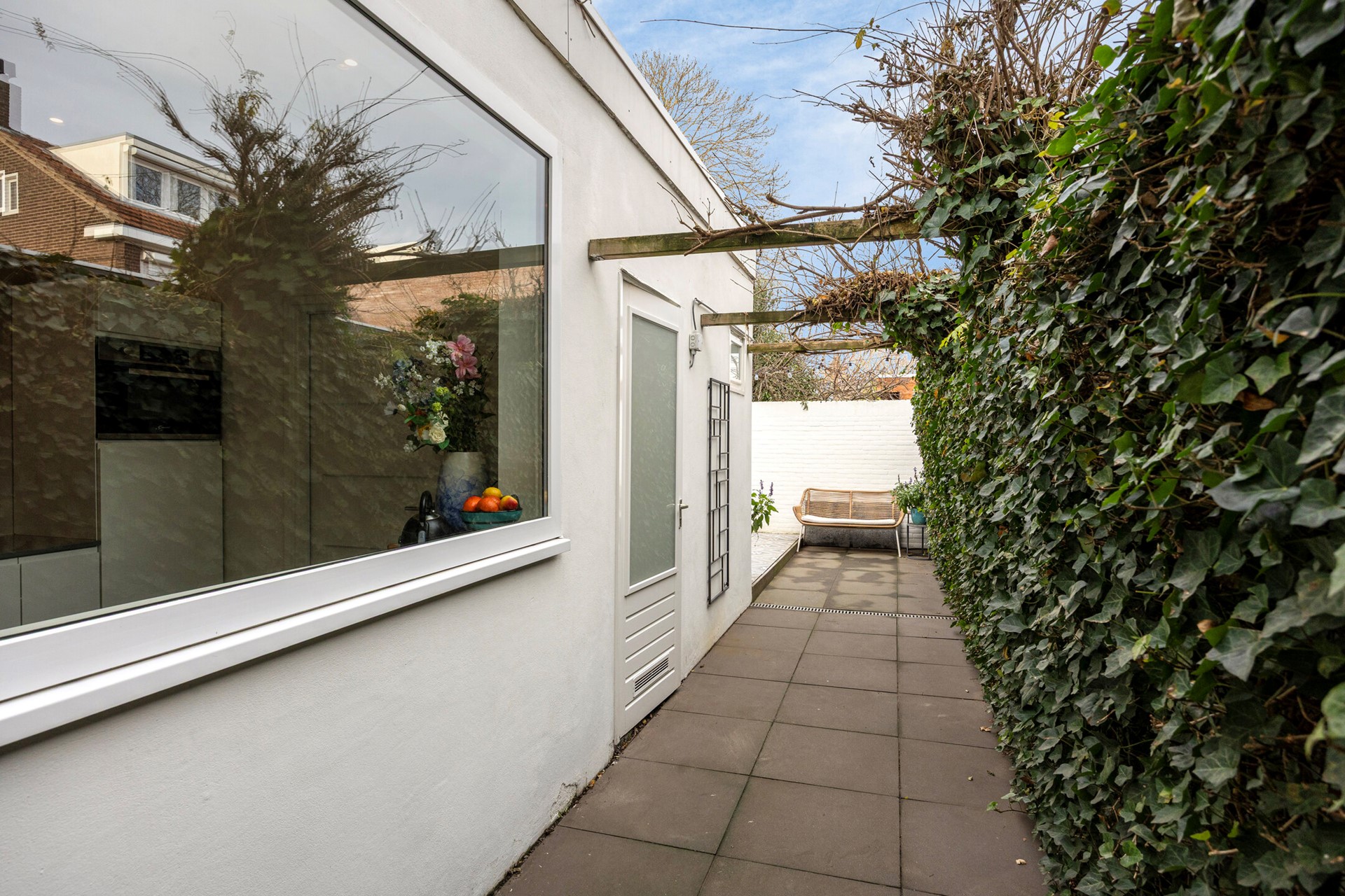 De achtertuin is verzorgd, onderhoudsvriendelijk en verrassend sfeervol. Gelegen op het noorden, maar dankzij de open ligging en slimme indeling een fijne plek om van de zon te genieten. Grote vierkante tegels geven de tuin een strak en modern karakter, terwijl de groene klimop zorgt voor zachtheid en privacy. Of je nu geniet van lange zomeravonden met vrienden, een rustig moment met een boek of een goed glas wijn — deze tuin vormt het perfecte decor.