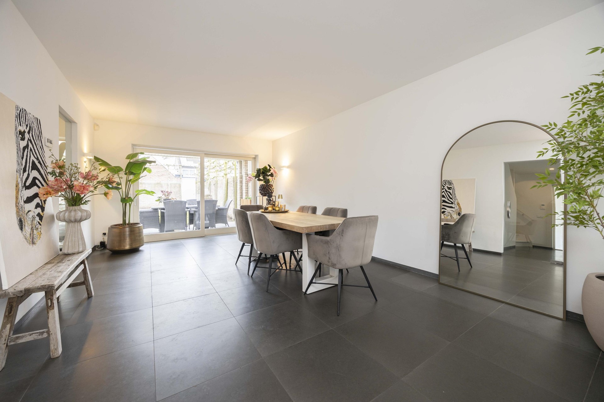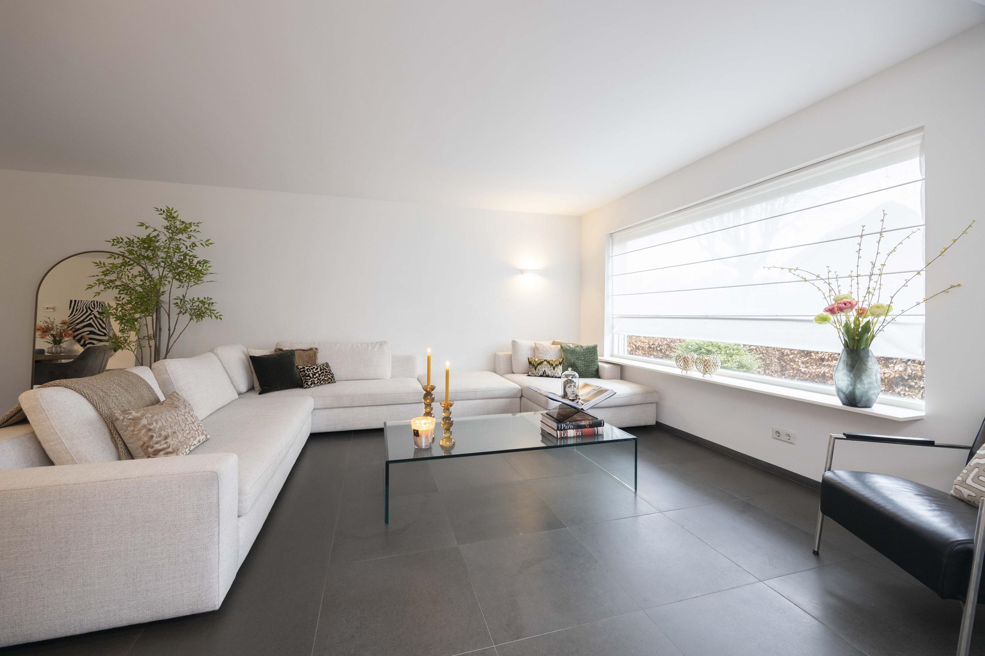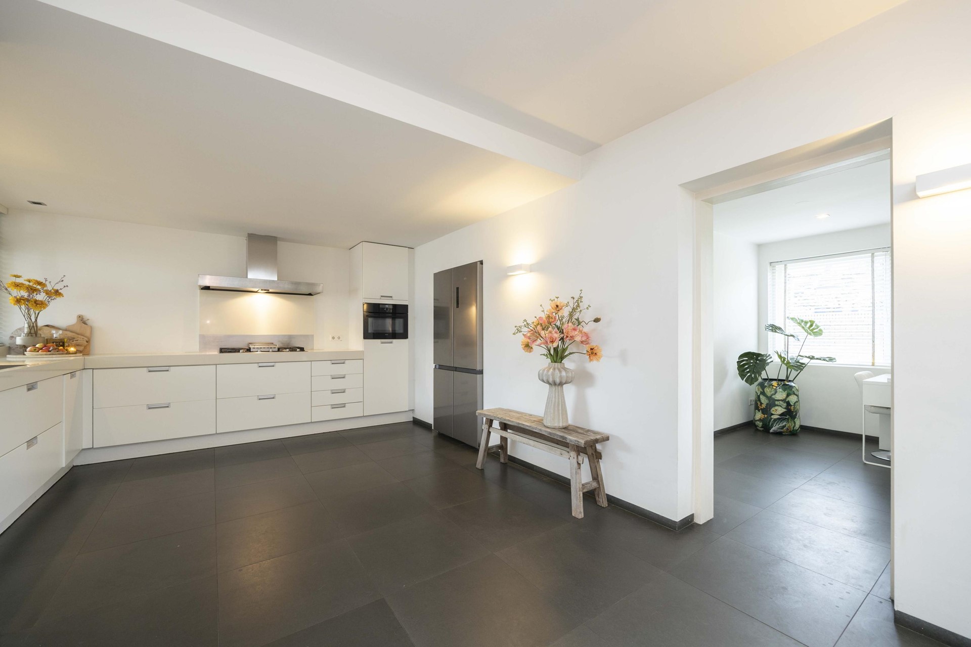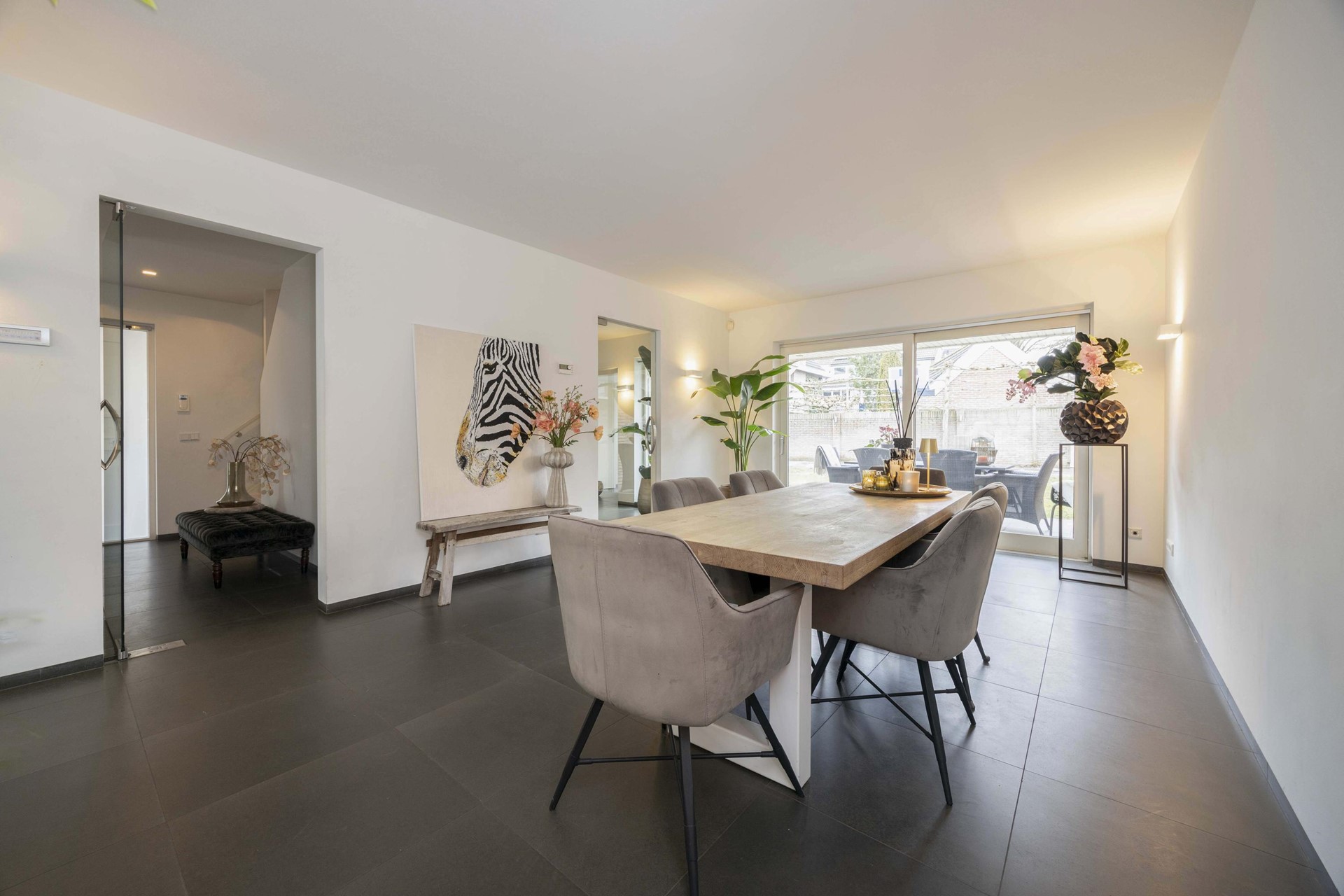 Stap binnen en ervaar direct de luxe van een woning die recent volledig is gestukt en geschilderd. Alles ademt frisheid, rust en verfijning. De antraciet tegelvloer met vloerverwarming, de strak verzonken plinten en de glazen taatsdeuren geven het geheel een moderne, high-end uitstraling. Hier hoef je niets meer te doen – alleen je meubels neerzetten en genieten.