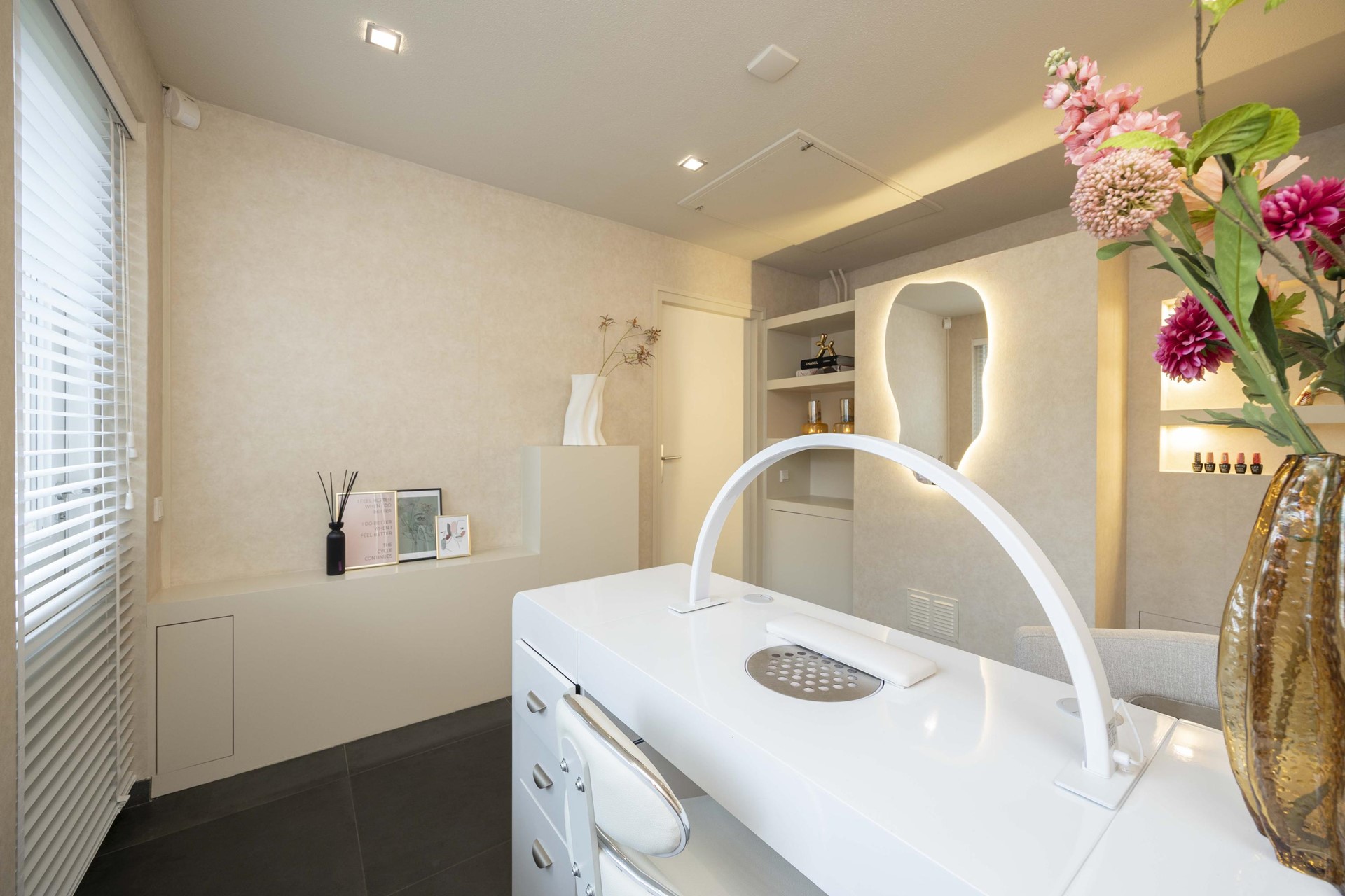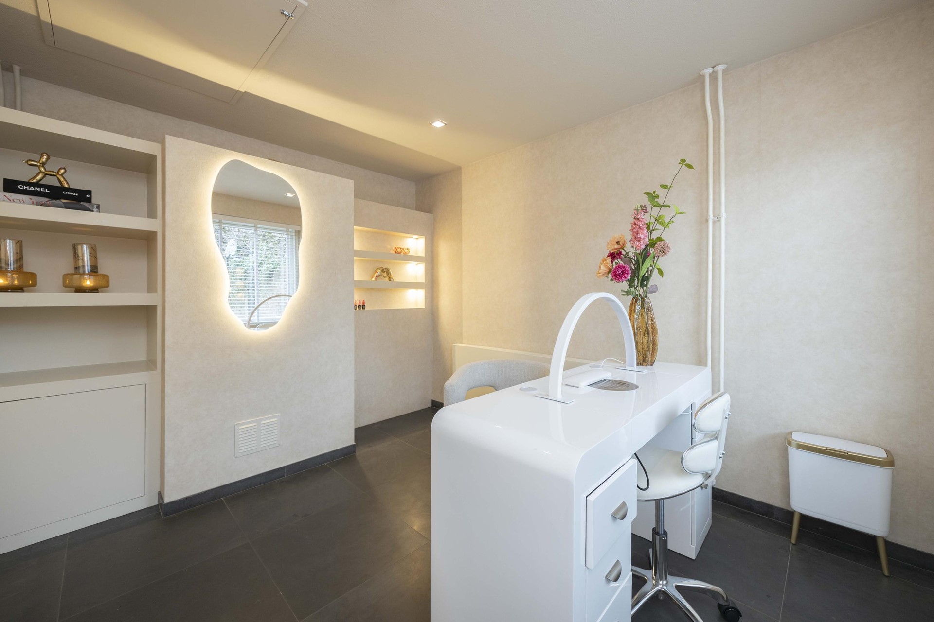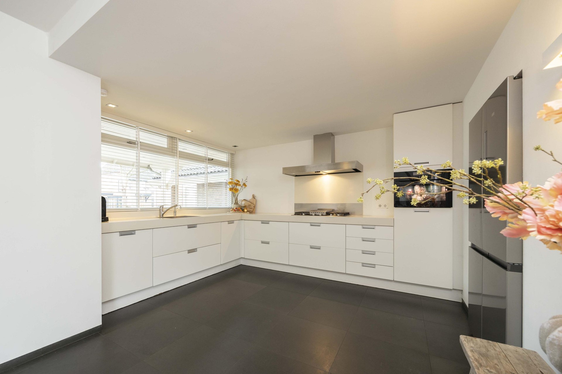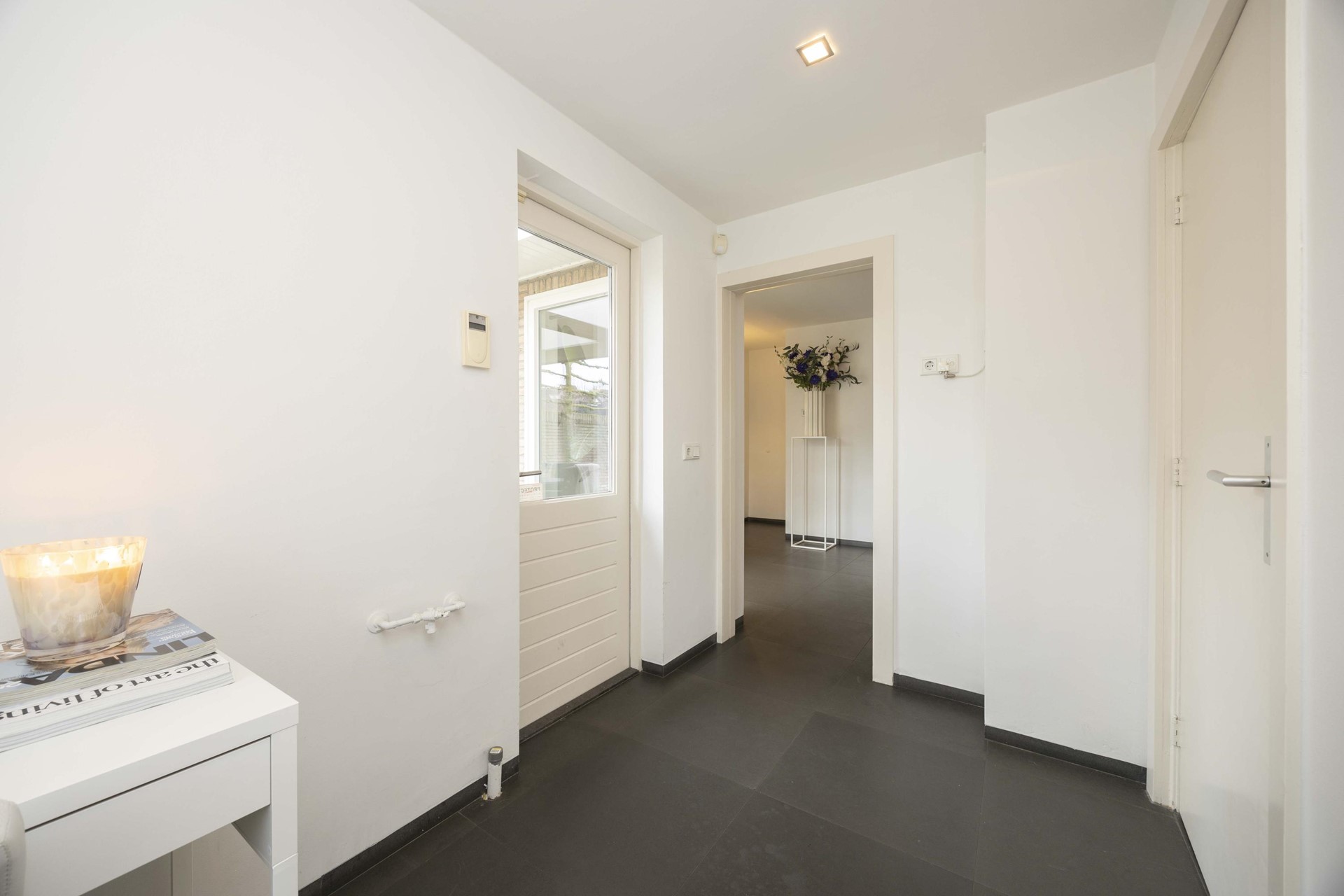 Stap binnen en ervaar direct de luxe van een woning die recent volledig is gestukt en geschilderd. Alles ademt frisheid, rust en verfijning. De antraciet tegelvloer met vloerverwarming, de strak verzonken plinten en de glazen taatsdeuren geven het geheel een moderne, high-end uitstraling. Hier hoef je niets meer te doen – alleen je meubels neerzetten en genieten.