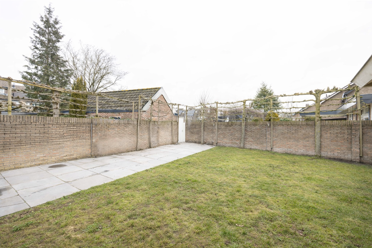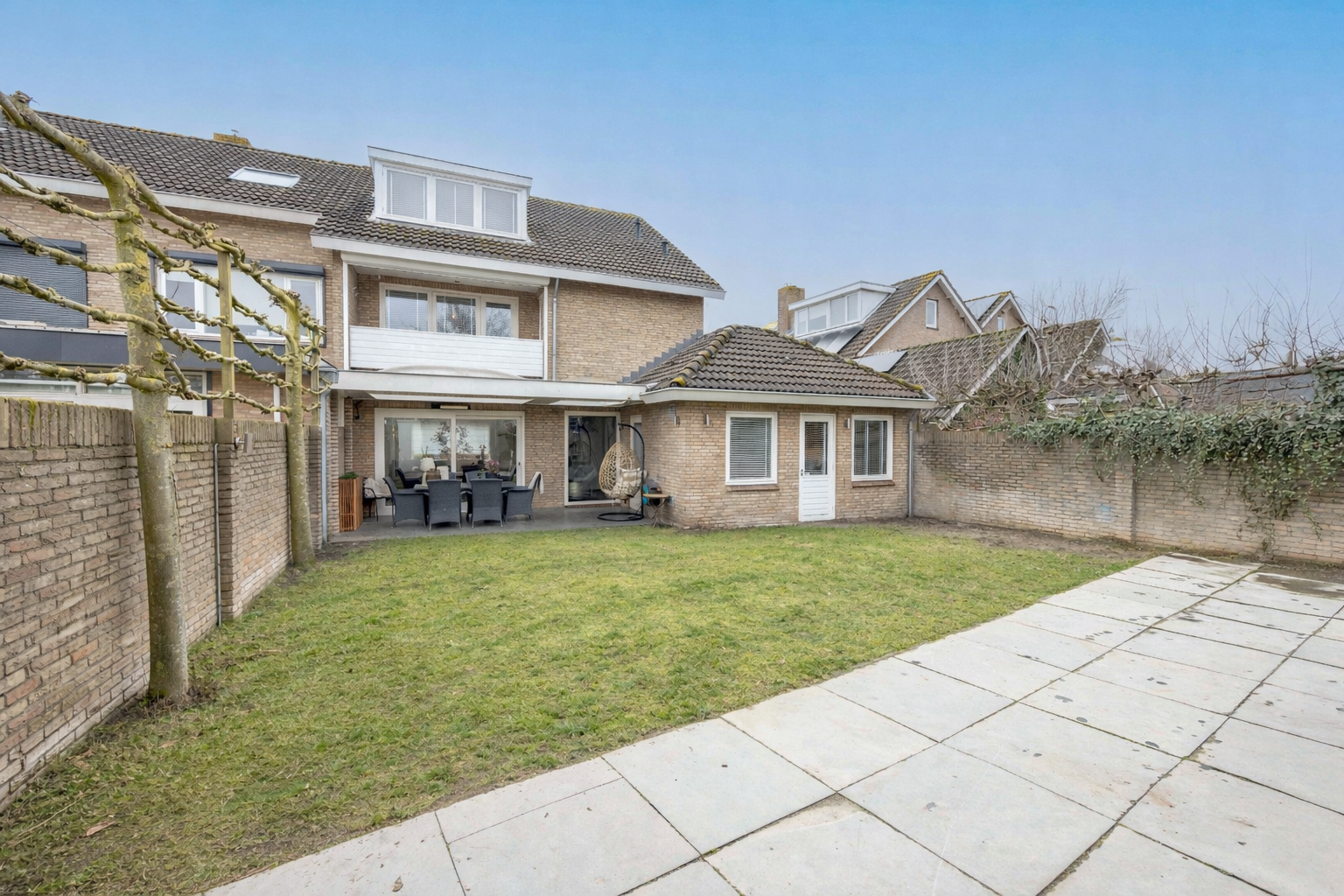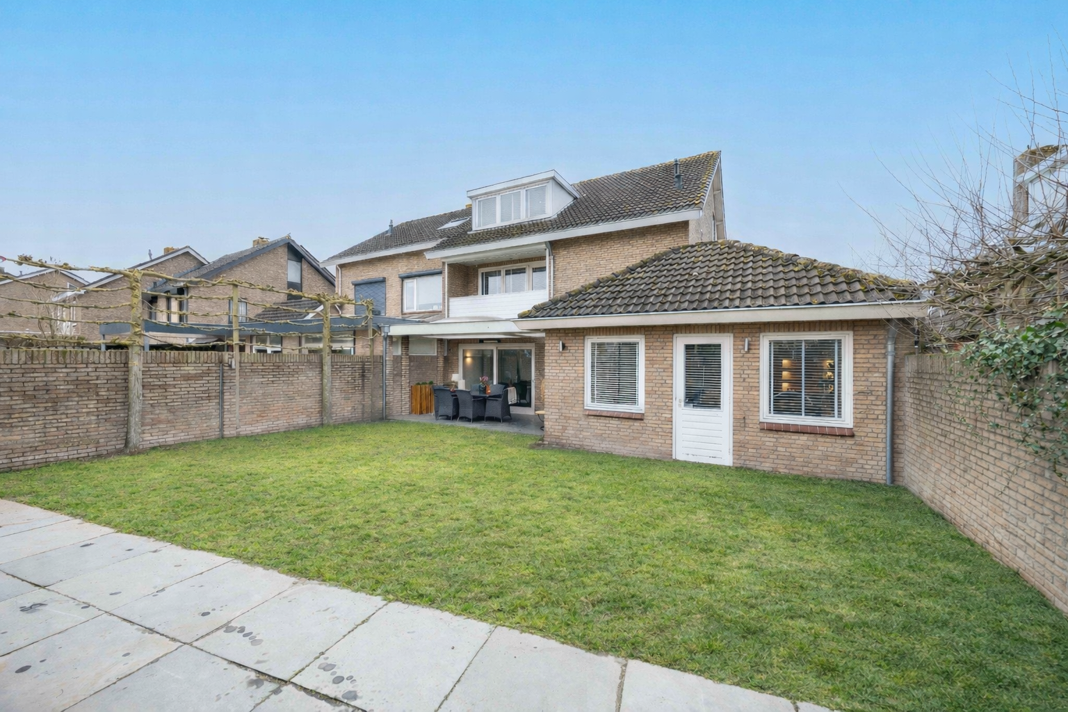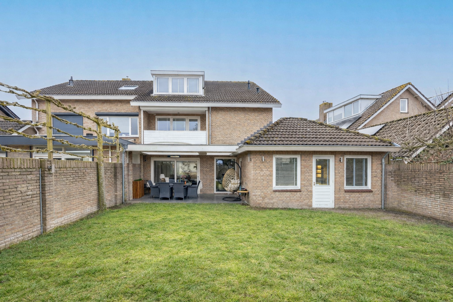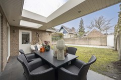De achtertuin op het noordoosten is een droom voor liefhebbers van buitenleven. Een riante overkapping met lichtkoepels vormt een verlengstuk van de woonkamer. Grote natuurstenen tegels, sfeervolle buitenverlichting, een gazon met sproei-installatie en zelfs een (voor te bereiden) buitendouche maken dit tot een tuin die 24/7 zon én schaduw biedt. Hier geniet je van lange zomeravonden, borrels onder de overkapping en spelende kinderen in een veilige, afgesloten omgeving.